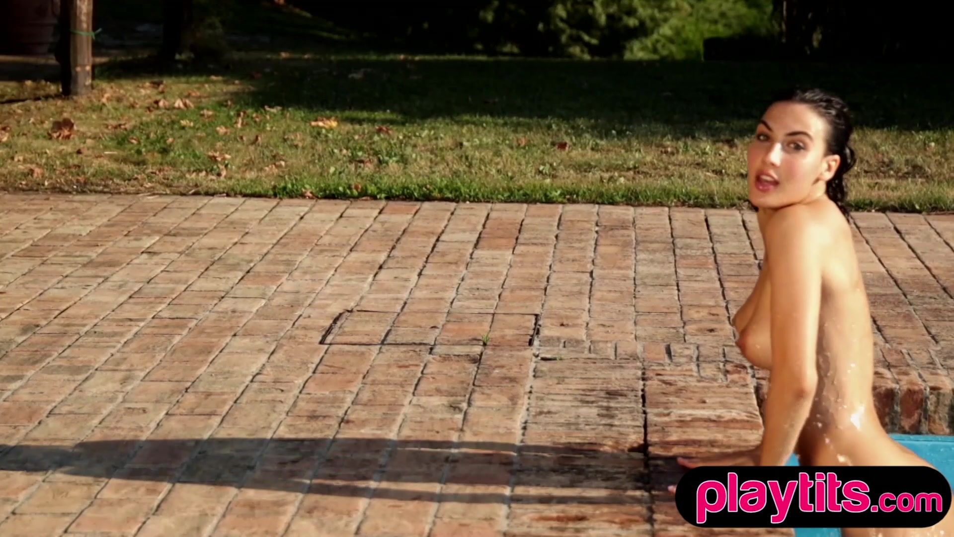 Luscious petite Latina beauty Gena Miller strips out of her sexy green swimwear by the pool and takes a dip in there before the Italian brunette starts displaying those juicy round tits along with her hairy lil pussy and big ass in a shoot for Playboy!