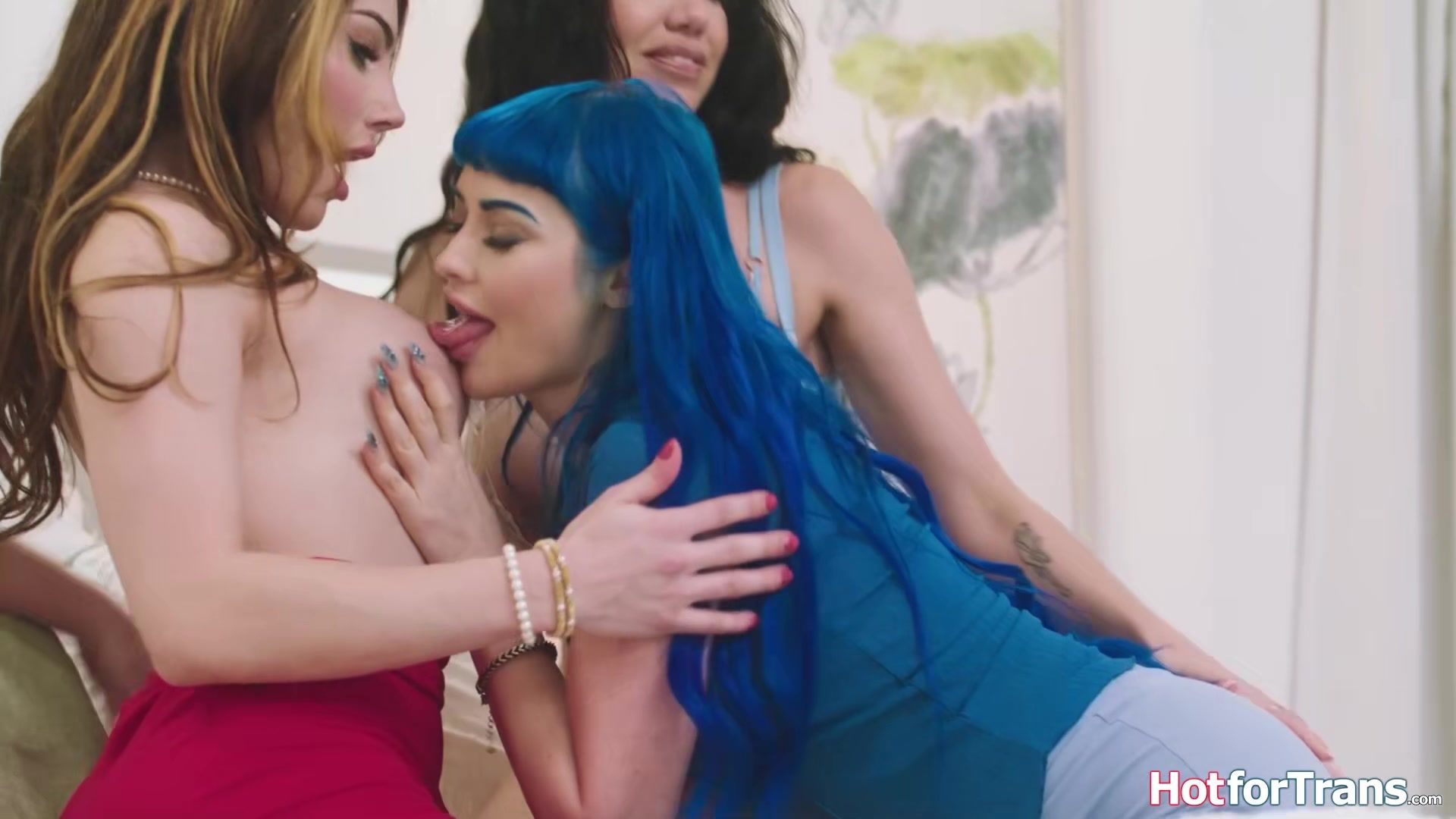 Busty couple Jewelz Blu and Little Puck take the house and want shemale Ariel Demures big trans cock to celebrate.The big tits tgirl is sucked off and facesits to get her ass rimmed by the milf whos pussy licked.The latin tranny anal barebacks them